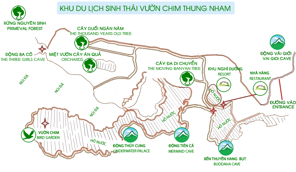 Sơ đồ khu vườn chim Thung Nham. Đảo Lửa đang nằm “đâu đó quanh đây”