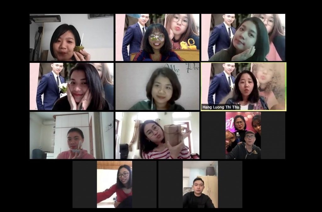 Thay đổi môi trường và cách thức làm việc, thì những hoạt động tập thể cũng được “biến tấu” theo cách mới đầy thú vị. Ngày ¼, tiệc sinh nhật online đặc biệt dành cho Thành PC và Trang TĐ vừa được tổ chức, Thắm dí dỏm bật mí: “Sinh nhật online tổ chức cũng rất gì và này nọ. Họp với nhau trước, nhà nào có bánh gì dùng bánh ấy, nhà nào có nến gì dùng nến ấy. Còn tạo hẳn background là ảnh của người được tổ chức sinh nhật. Người chuẩn bị bánh quy, người chuẩn bị chocopie. Nến thì chị lấy vội trên …bàn thờ nhà chị. Thế mà vui”.