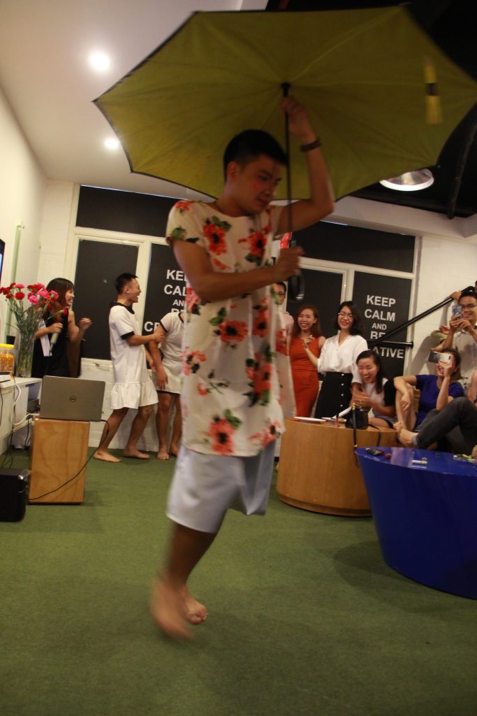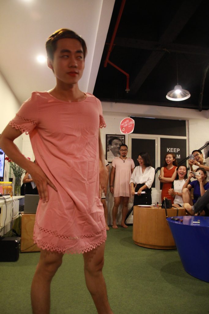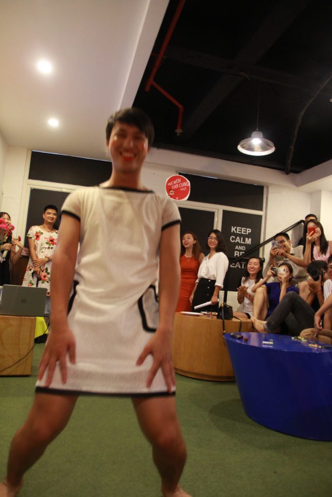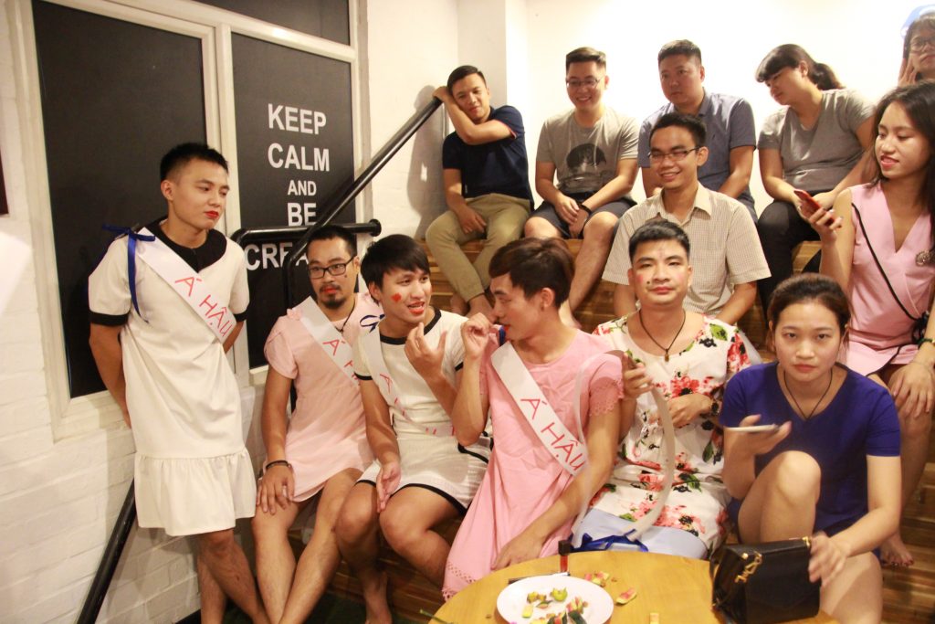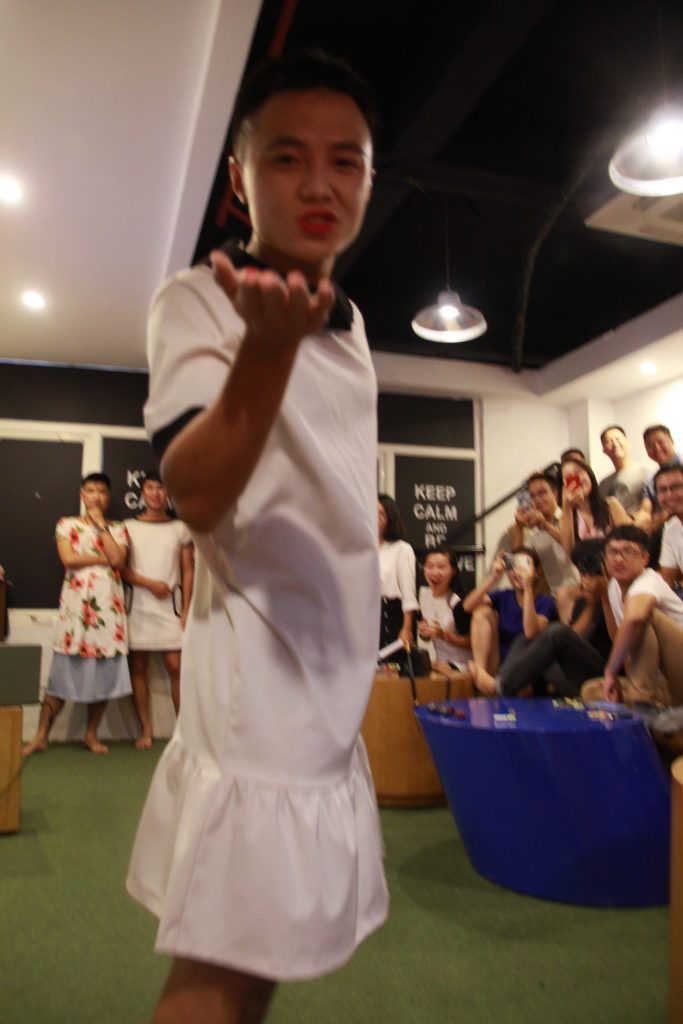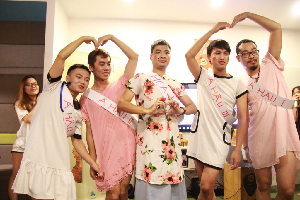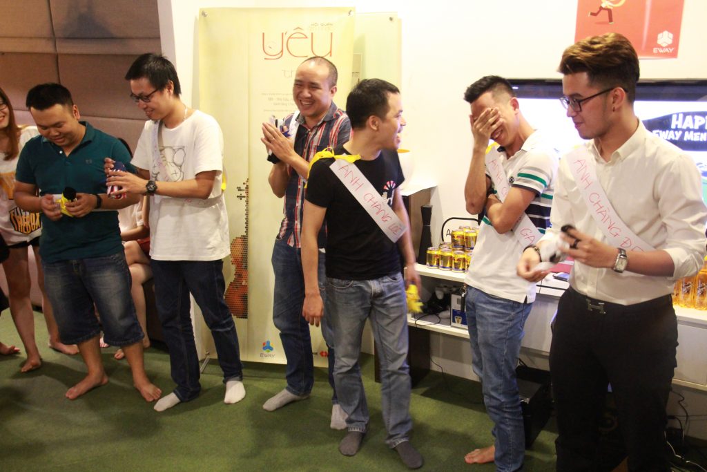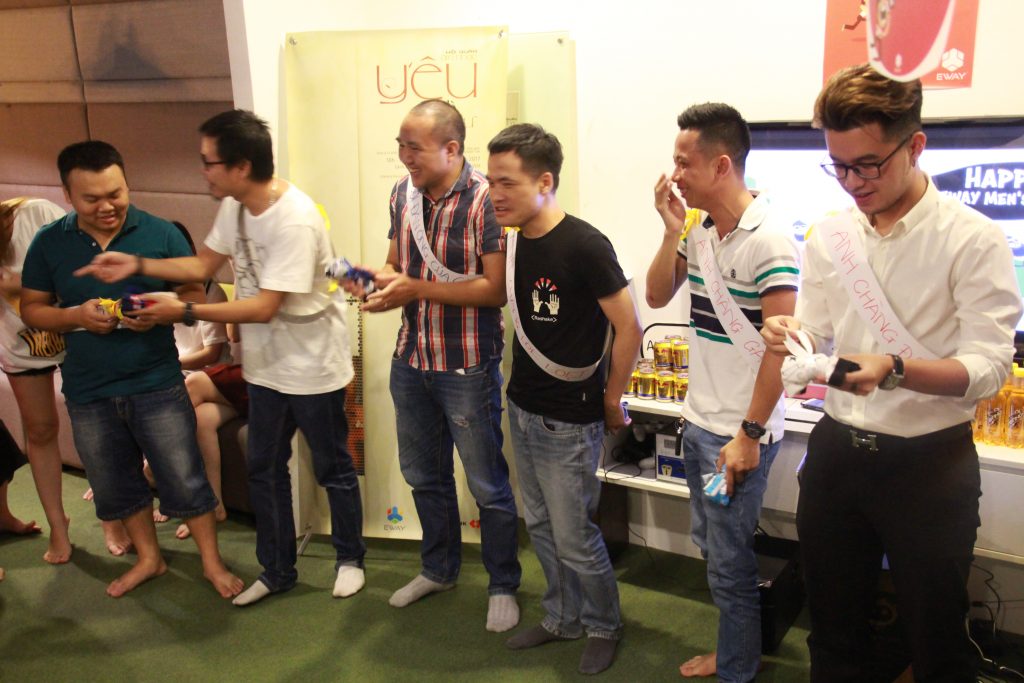 Và EWAY Men’s Day đã đến. 4h30’ loa gọi toàn thể công ty tập trung ở khu sinh hoạt chung để chương trình được bắt đầu. Hai MC duyên dáng Hồng Ngọc và Thu Hương đã mời 5 anh em nhiệt tình nhất và tự nguyện lên sân khấu, bao gồm các anh Thắng Cú Lợn, Tú, Kiên, Ngọc, và Hiếu. Mỗi anh được mời vào phòng kín để 5 chị em “chăm sóc” cho phần thi Hoa Hậu EWAY mà các anh không hề biết cho đến phút thử đồ.